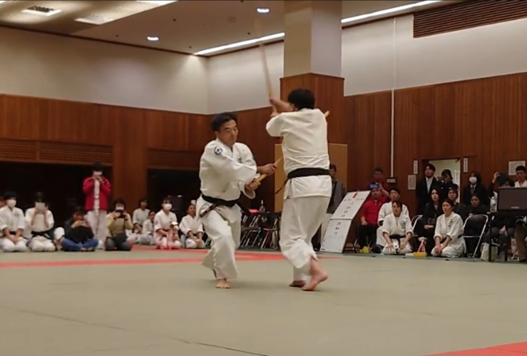 昭道館合気道には競技大会(試合)があります。競技大会は日々の稽古の成果を客観的に見ることのできる場であると同時にコミュニケーションの場でもあります。競技での対戦相手は勿論のこと、会場に来ている他団体の人たちと交友関係を広げるチャンスでもあります。もちろん競技大会参加は強制参加ではありませんので、日々の稽古だけでも問題ありません。