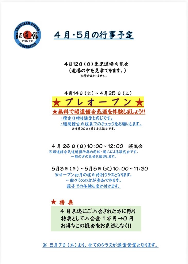 4月5月体験会・演武会発表 2026 3/30 イベント 2026年3月28日2026年3月30日 Screenshot お待たせ致しました。 体験会の日時が確定したため、お知らせになります。 皆様のご参加を心からお待ちしております。 ここで作陽高校柔道部監督の川野一道先生のYouTubeチャンネルを紹介します。ぜひご覧ください。 \ 最新情報をチェック / FacebookXCopy イベント よかったらシェアしてね! URLをコピーしました! URLをコピーしました! 昭道館合気道連盟東京道場 開設祝賀会のご案内 この記事を書いた人 樋口 功祥 関連記事 昭道館合気道連盟東京道場 開設祝賀会のご案内 2026年3月2日